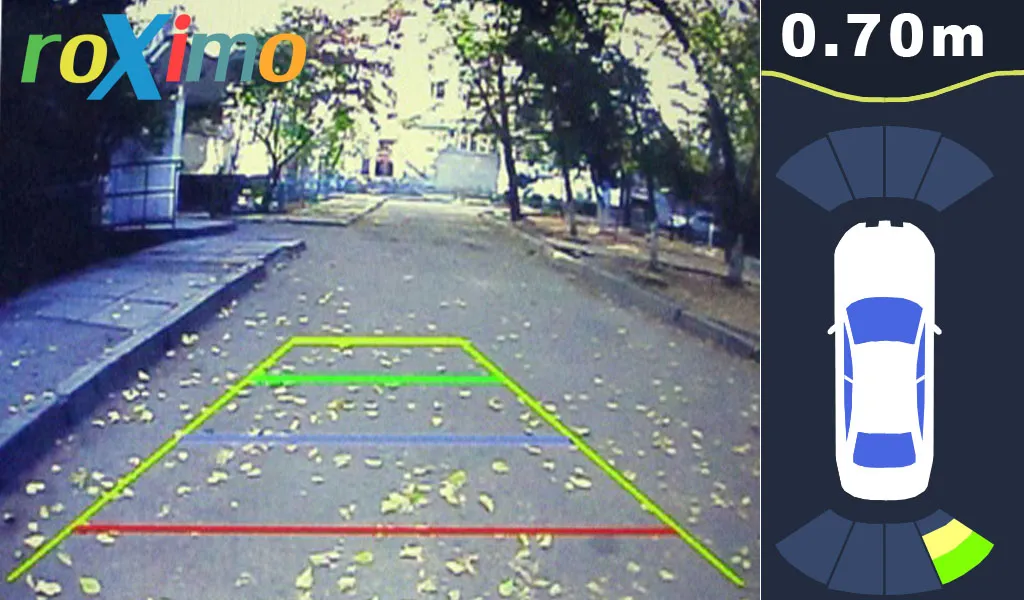 Парковочный радар Roximo с входом для камеры (Видеопарктроник) RPV-001 позволяет подключать парковочную камеру и выводить изображение камеры вместе с датчиками на экран штатной магнитолы, монитор или зеркало со встроенным монитором